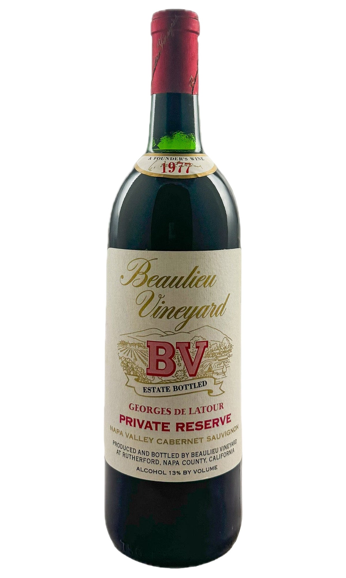 "Coming from the second drought vintage in a row in the 1970s in Napa, although yields were closer to normal this year, the wine spent two years in 50-gallon American oak barrels prior to bottling. The alcohol came in at 13%. Medium tawny-brick colored, the 1977 Cabernet Sauvignon Private Reserve Georges de Latour reveals compelling menthol, smoked meats and Indian spice scents with a core of kirsch, mincemeat pie and new leather plus hints of dried flowers and cast iron pan. Medium-bodied with lovely purity and bold freshness, it features plush, very fine-grained tannins supporting muscular dried berries, finishing on a mineral note." -Lisa Perrotti-Brown