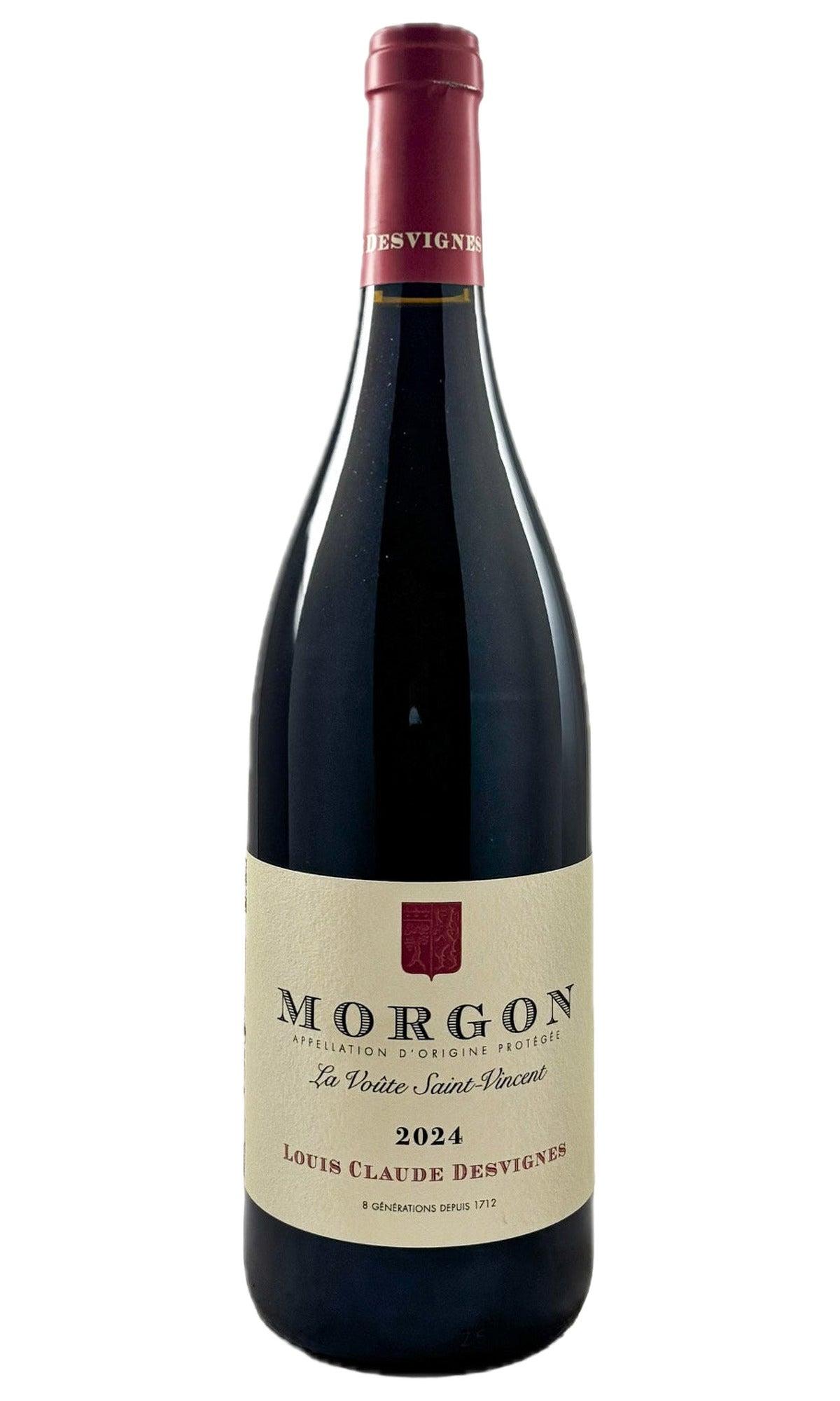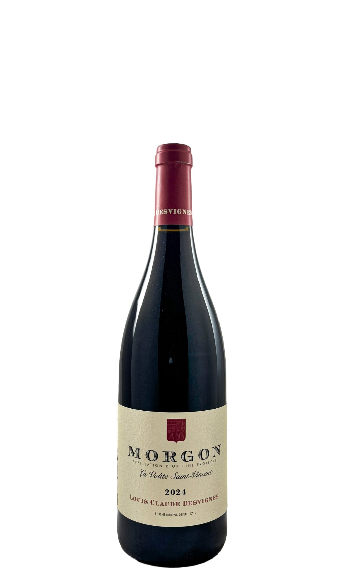 100% Gamay. The beginning of the Desvignes range is "La Voûte Saint Vincent", named for the vault or "voûte" of the old family house and for the patron saint of winemakers. It is a blend of certified-organic estate parcels totalling 4.5 hectares in the climat of Douby, which lies in the northeast corner of Morgon along the border of Fleurie. The La Voûte vines average 45 years old and are planted in sandy, decomposed-granite soils. Harvest is manual. The bunches are generally left about 50% whole-cluster and 50%-destemmed and gently pressed into closed concrete vats for a partly carbonic fermentation; maceration is 10-12 days with a submerged cap and no punchdowns. A very small amount of sulfur is added after malo and sometimes at bottling. The wine is aged in concrete vat for 7 months and bottled with a light, non-sterile filtration.