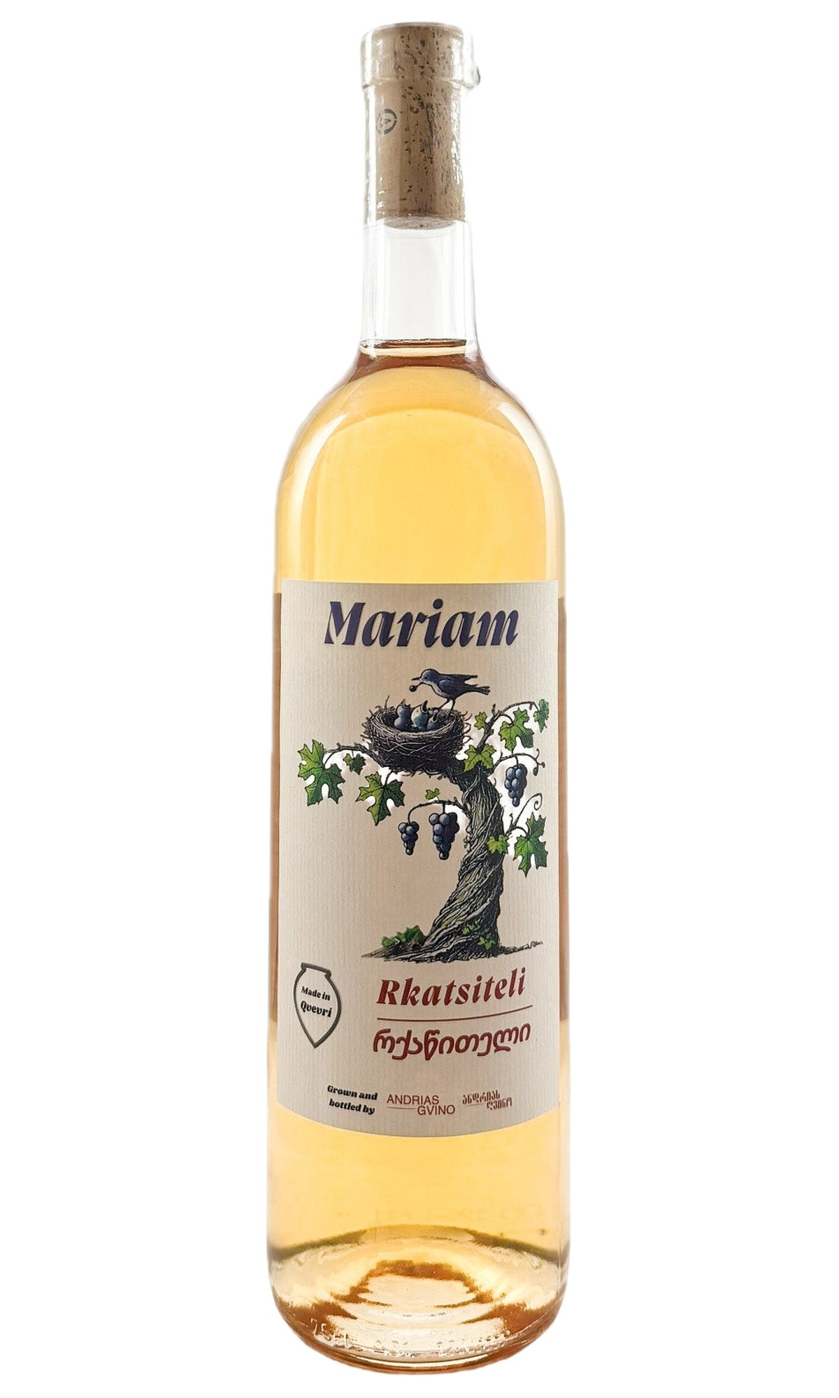 Andria Gvino’s 2024 “Mariam” Rkatsiteli is made in Georgia’s Kakheti region with organic farming and traditional qvevri fermentation. Grapes are fermented with stems and skins for four months in buried clay vessels.