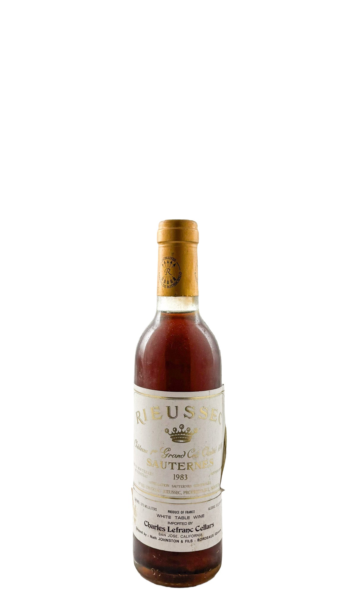 "Light golden with just the slightest tint of green, the 1983 Rieussec, from an excellent year for Sauternes, is certainly one of this property's greatest wines. Well structured with excellent acidity, and a deep, long, rich, full-bodied, viscous texture, this wine, despite the richness and power, is neither heavy nor cloying. It has gorgeous balance and a very long, lingering, spectacular finish. One of the great successes of the vintage." -Robert M. Parker, Jr.