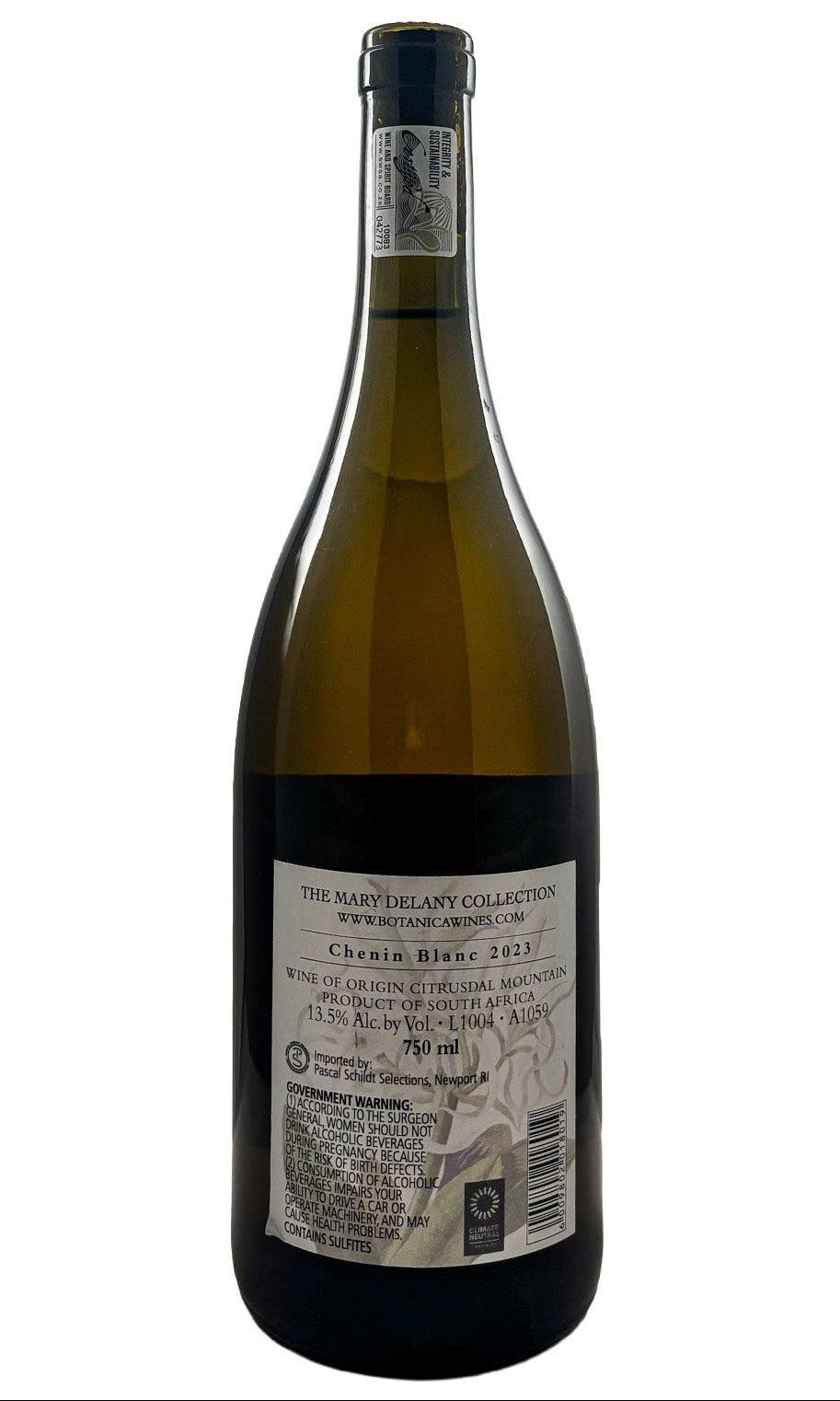 "The Botanica Wines 2023 Citrusdal Mountain Chenin Blanc The Mary Delany Collection boasts a beautiful floral design on the front label, and those pretty graphics match the linear presentation and sharp fruit nuances of this bright South African white. White flower, plumeria, ponderosa lemon, summer peach and crushed stone lift from the bouquet. The mouthfeel has a creamy element that adds to the wine's mid-weight texture. These grapes are purchased from a vineyard planted in 1960 on their own roots near Clanwilliam in the Olifants River Valley in the Western Cape." -Monica Larner
